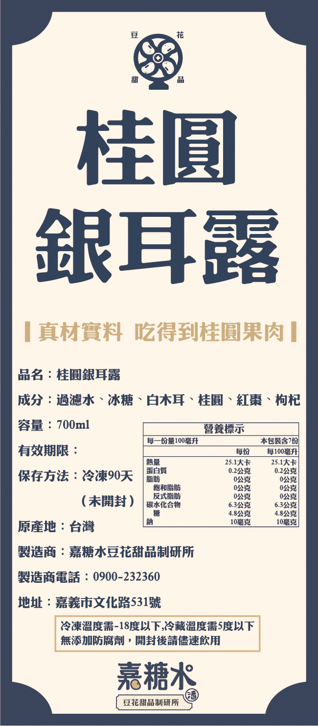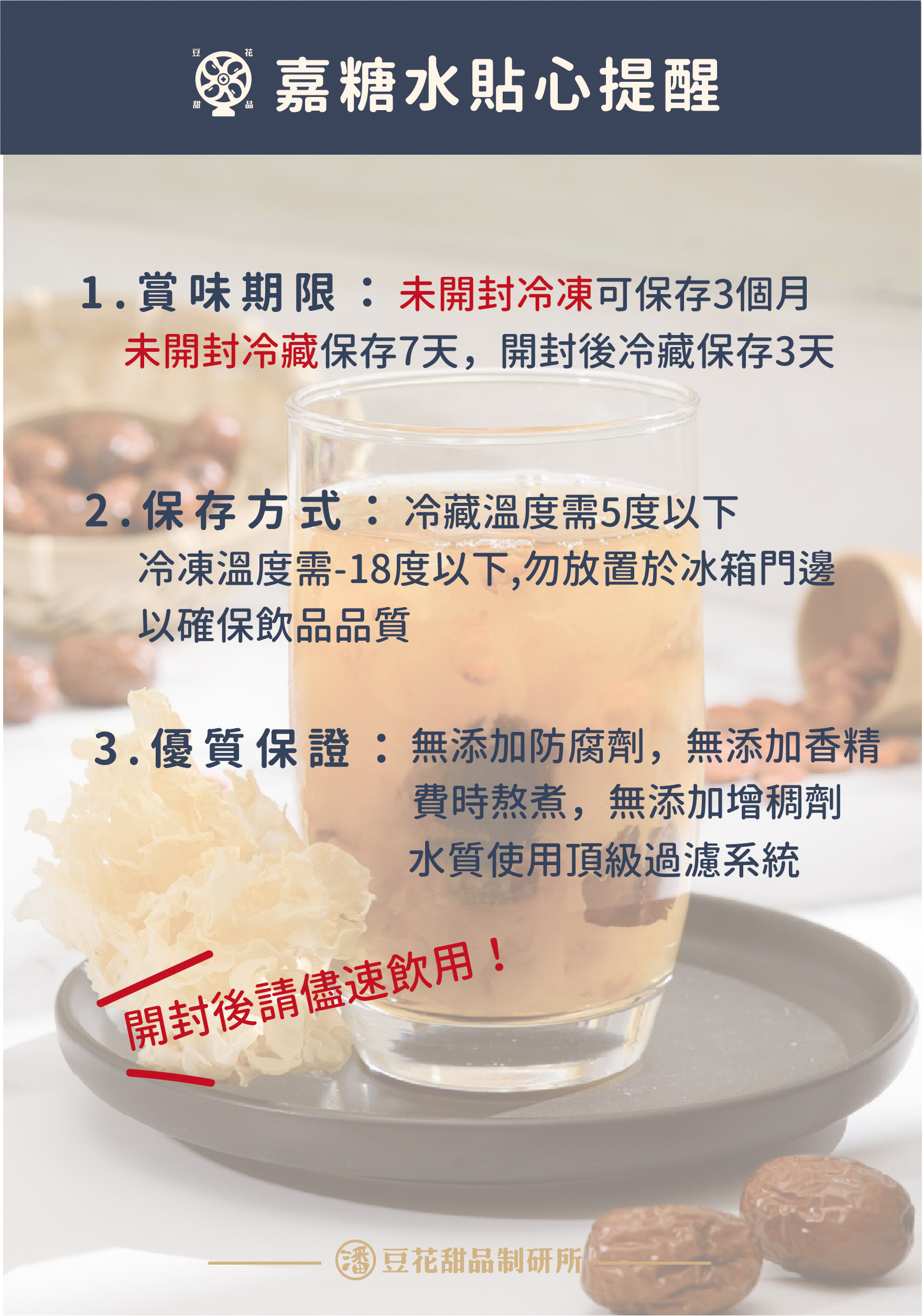 成份:過濾水、冰糖、白木耳、桂圓、紅棗、甘草、枸杞