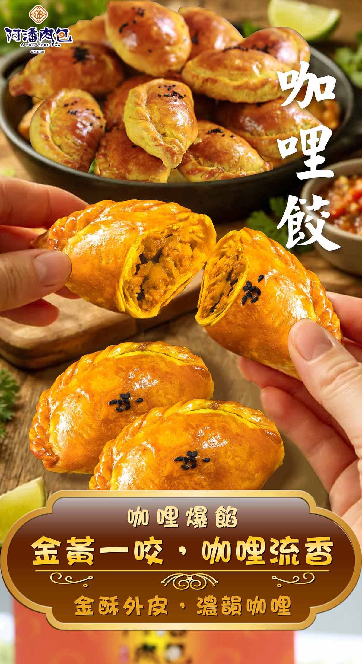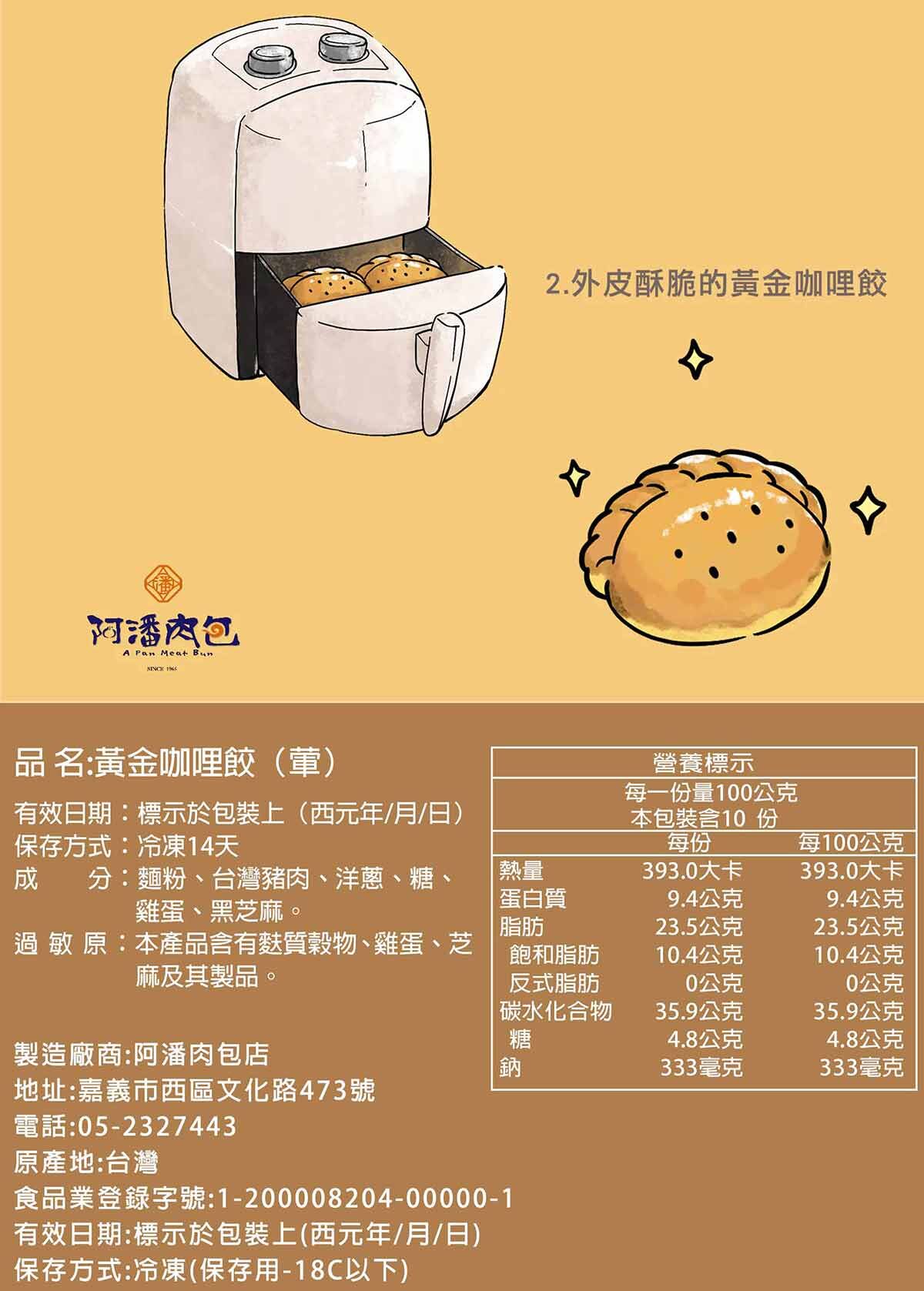 成份:麵粉、豬後腿肉(台灣)、咖哩粉、洋蔥、砂糖、雞蛋、黑芝麻