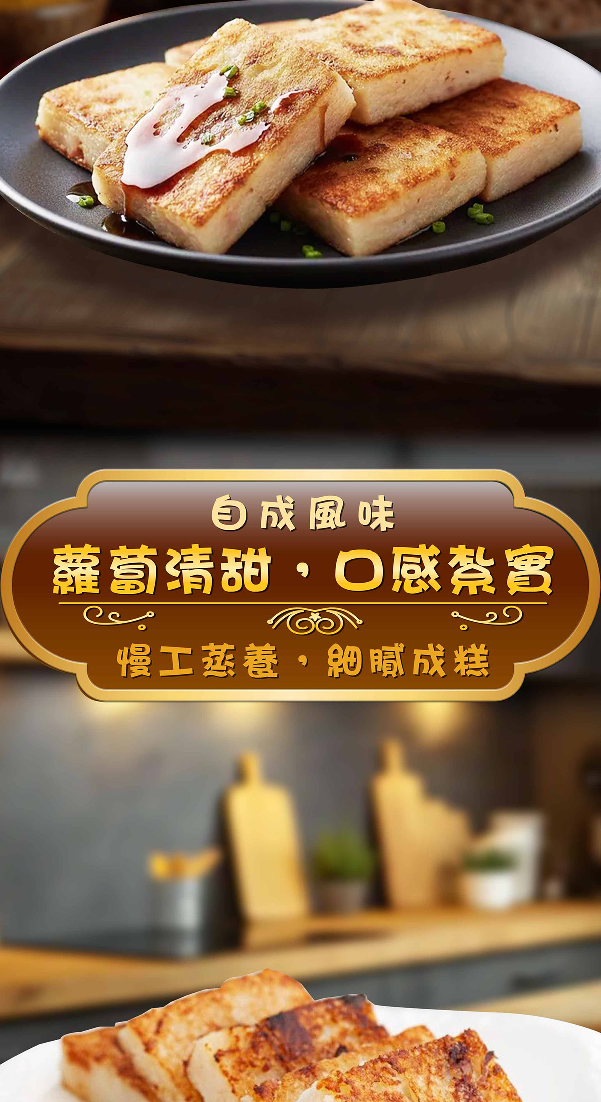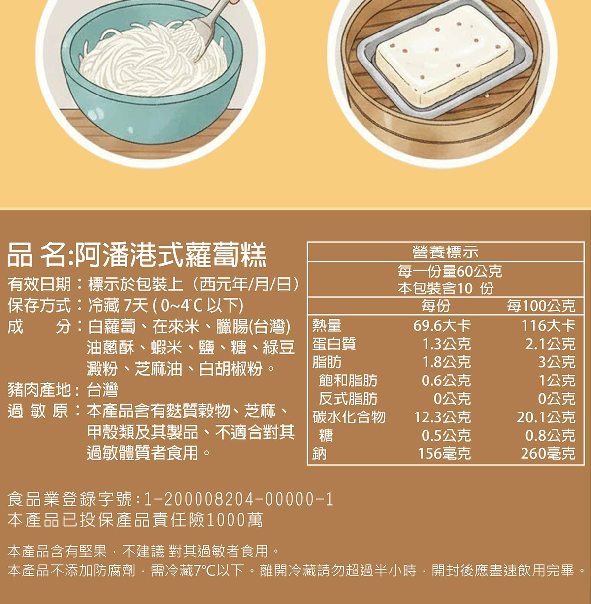 成分:白蘿蔔、水、在來米、鹽、味素、糖、太白粉、香油、蝦米、臘腸、白胡椒粉、蔥酥