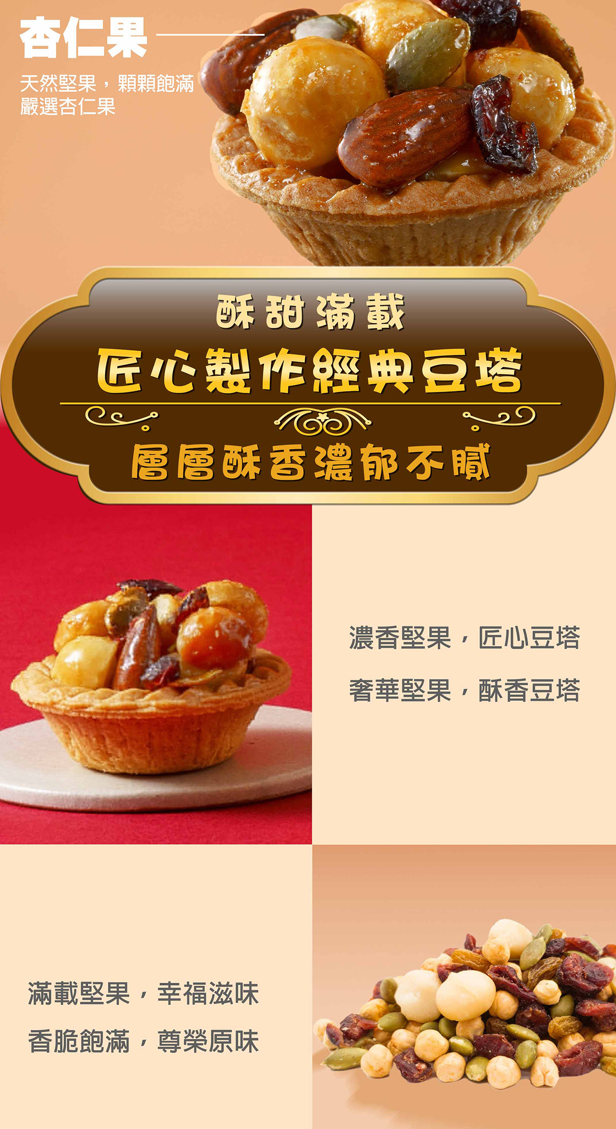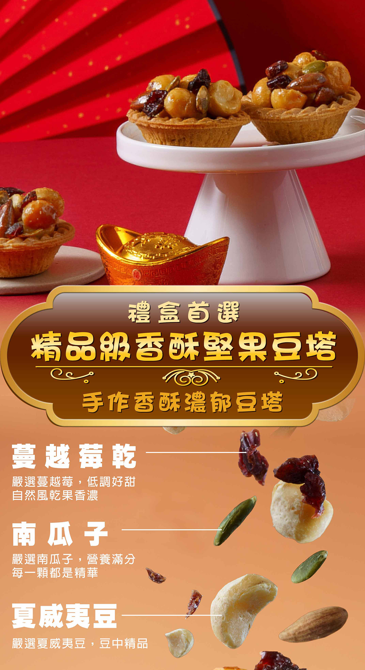 成份:塔皮(小麥麵粉、奶油、糖粉、雞蛋、鹽)、夏威夷豆(澳洲)、杏仁果、南瓜子、蔓越莓乾、麥芽糖、二砂糖、龍眼蜜