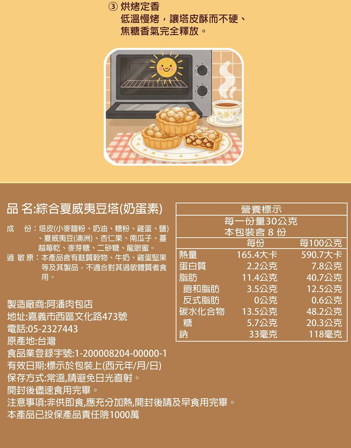 過敏原:本產品含有麩質穀物、牛奶、雞蛋、堅果等及其製品,不適合對其過敏體質者食用