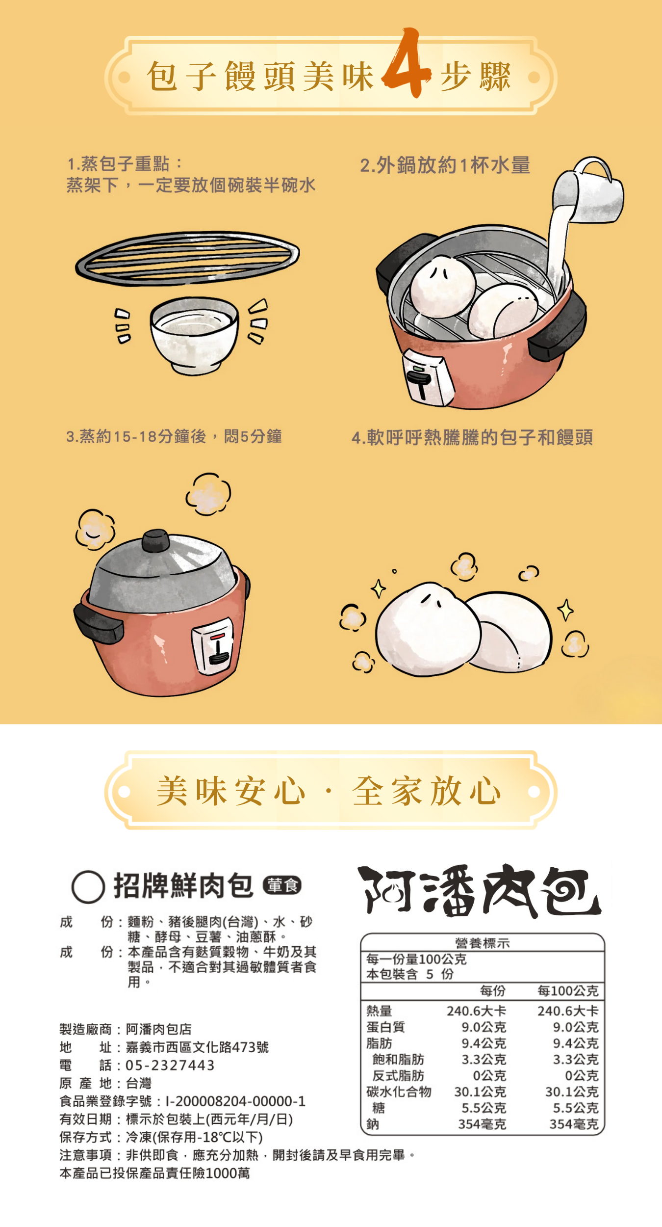 成份:麵粉、豬後腿肉(台灣)、水、砂糖、酵母、豆薯、油蔥酥
